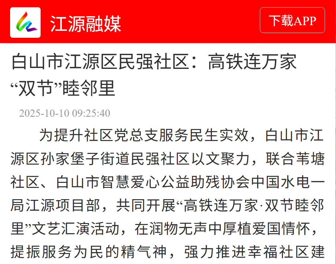 為提升社區黨總支服務民生實效,白山市江源區孫家堡子街道民強社區以文聚力,聯合葦塘社區、白山市智慧愛心公益助殘協會中國水電一局江源項目部,共同開展“高鐵連萬家·雙節睦鄰里”文藝匯演活動,在潤物無聲中厚植愛國情懷,提振服務為民的精氣神,強力推進幸福社區建設。