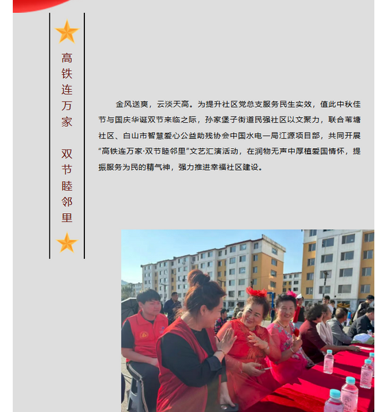 金風送爽,云淡天高。為提升社區(qū)黨總支服務民生實效,值此中秋佳節(jié)與國慶華誕雙節(jié)來臨之際,孫家堡子街道民強社區(qū)以文聚力,聯(lián)合葦塘社區(qū)、白山市智慧愛心公益助殘協(xié)會、中國水電一局江源項目部,共同開展“高鐵連萬家·雙節(jié)睦鄰里”文藝匯演活動,在潤物無聲中厚植愛國情懷,提振服務為民的精氣神,強力推進幸福社區(qū)建設(shè)。 https://mp.weixin.qq.com/s/sjHtZIve9EB6dRZ6oCb1Gw |